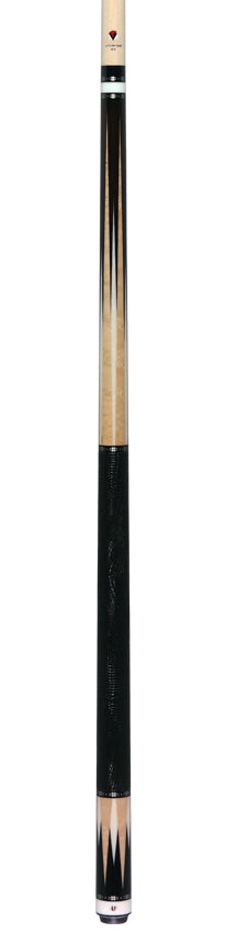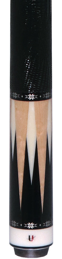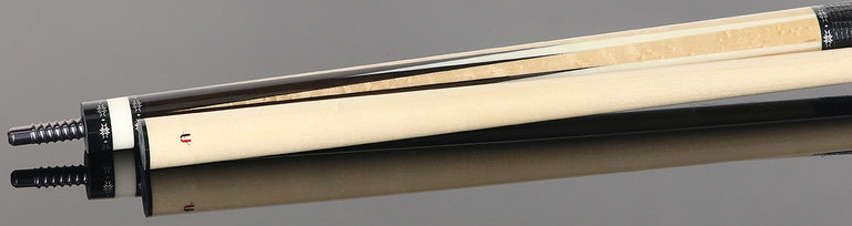 This cue blends refined aesthetics with precision engineering, starting with a rich ebony forearm adorned with six long, natural Birdseye maple points. These are complemented by three mid and three short white poly points, creating a visually striking and balanced design. The ebony butt sleeve echoes this motif, featuring six long Birdseye maple points along with matching mid and short white poly inlays, offering seamless continuity throughout the cue's body.