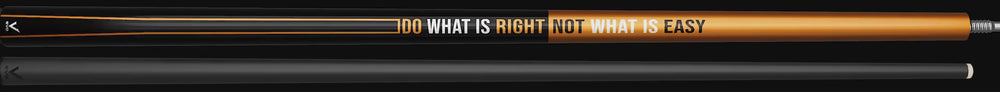 The cue’s construction pairs carbon and glass fiber for unmatched strength, power, and stability, giving you total command from the very first shot. The forearm blazes in bold orange, emblazoned with “Not What Is Easy,” while the sleek black butt sleeve and wrap section bear “Do What Is Right” over a striking orange rectangle—an emblem of focus and fire.