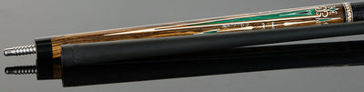 This exceptional cue showcases the artistry and technical precision that define Jacoby’s custom work. The forearm and butt sleeve are built from bold, beautifully grained Bocote, a hardwood prized for its dramatic contrast and natural depth. This foundation is elevated with complex inlays of vibrant Malachite and sleek White Juma, meticulously cut and set with precision to create a rich, layered design that radiates sophistication.