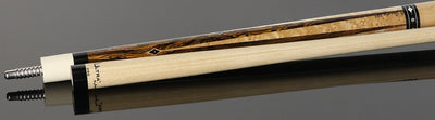 Exuding sophistication and precision, this cue is a stunning fusion of artistry and performance. The forearm is crafted from luxurious, hand-selected Bocote wood, sourced from the heart of Mexico—renowned for its striking grain patterns and natural depth. Set into this rich canvas are three elongated Birdseye maple points and three shorter Curly maple points, arranged in perfect symmetry. Each point is crowned with a sleek black Juma diamond, accented by refined Jeweler’s bronze rings, creating a look that is both bold and meticulously detailed.