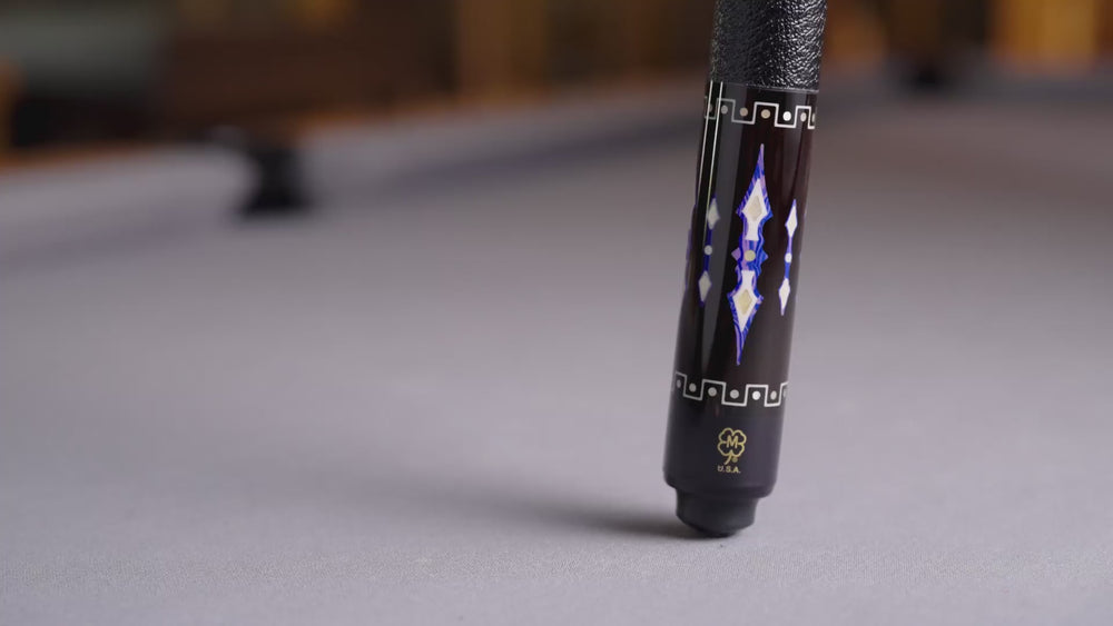 This **limited edition cue—one of only 50 ever made—**is a showcase of refined craftsmanship and timeless design. The Birdseye Maple forearm features six ebony points accented with blue river agate, gold Mother-of-Pearl, and white urethane, perfectly complemented by an ebony sleeve detailed with eight matching sets of intricate inlays. Elegant white urethane “Battlement” rings set with gold Mother-of-Pearl dots add a luxurious finishing touch.