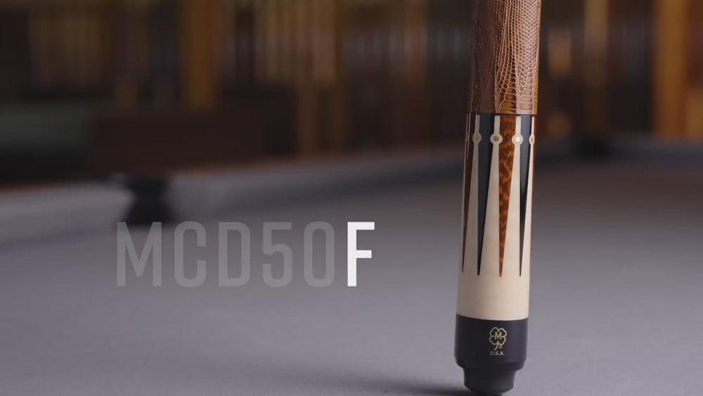 The MCD50F stands as a striking collector’s edition, boldly reimagining the celebrated G705 by inverting its visual essence into a warmer, more opulent design. Where the original featured black urethane, this anniversary edition embraces the natural beauty of curly maple in both the forearm and sleeve, creating a luminous canvas that highlights its intricate detailing. Twenty meticulously crafted snakewood and ebony points rise with dramatic contrast, each accented by the soft radiance of twenty brass dot inlays that replace the original pewter and silver with a richer, golden glow. The look is completed with a brown lizard-embossed leather wrap, lending texture, luxury, and a warm balance to the cue’s presence. Refined brass rings, McDermott’s precision-engineered 3/8"-10 joint, and the advanced i-Pro high-performance shaft elevate its playability to the highest tier. Embellished with the exclusive “50th Anniversary” logo transfer and accompanied by a commemorative case, the MCD50F is more than a cue—it is a statement piece, uniting artistry, innovation, and heritage for the most discerning players and collectors.