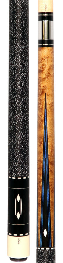 The Schon STL10 Blue Pool Cue is constructed with Birdseye Maple, Ebony, and Irish linen for a professional look and feel. The cue features 4 points with alternating blue and black veneers, each with a white diamond inlay. The Ebony butt sleeve is embellished with white diamond inlays and custom rings. Each cue is uniquely designed with a variety of stains, inlays, and butt colors by Schon Cues.